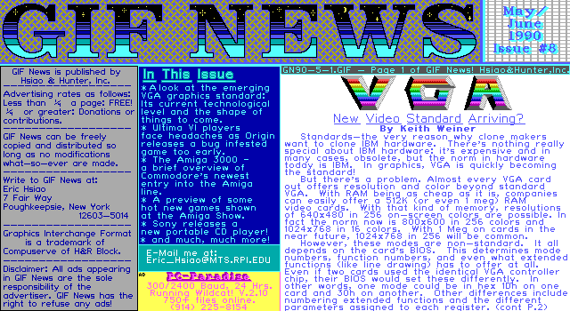 ---===> GIF News <===--- May/June 1990 * Sorry about the 2 week delay in the release of this issue. This past month has been very busy, but hopefully there will be no delays in the future. * Articles in this issue include: A detailed look at VGA, information on Ultima VI, The World of Amiga show in NYC, Sony's new CD player, and more! * Some changes have occured in GIF News. Philippe Rabergeau of New York City suggested that I rename the individual pages so that the year comes before the month to make sorting easier. It is a very good idea, this and all future issues will be named GNyrmo-#.GIF. For example: GN9005-1.GIF | \_ \___ Year | \ Month Page # (May) * Also, this issue has 5 pages instead of the usual 4. I hope you like it! With your continued support, GIF News will keep getting better! Please upload it to all your favorite BBS's. Thanks! Eric Hsiao 7 Fair Way Poughkeepsie, New York 12603-5014 E-Mail: Internet => Eric_Hsiao@MTS.RPI.EDU BITNET => userID=GJ8L@RPITSMTS.BITNET Call The Channel 1 BBS at (617)354-8873 and leave me a message.